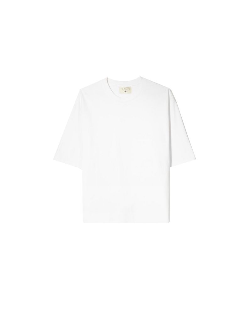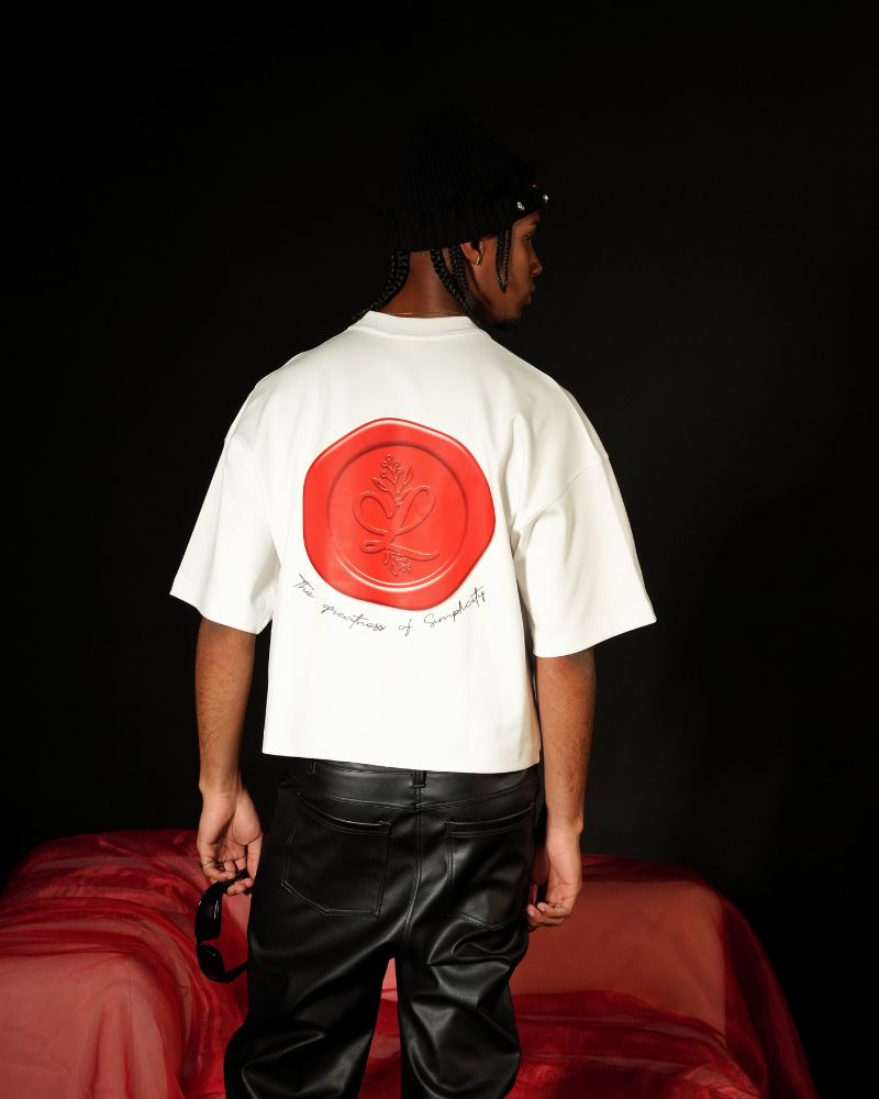 Camiseta basica blanca horma boxfit y regular con estampado grande en espalda diseño sello lacre.