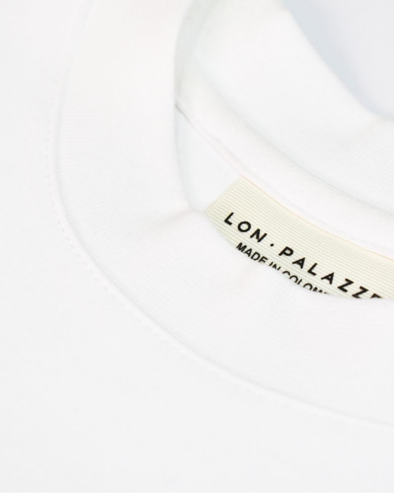 Camiseta basica blanca en tela de 230 gramos , cuello semi alto con parche bordado en el pecho . Disponible en horma Box fitófaga y regular .