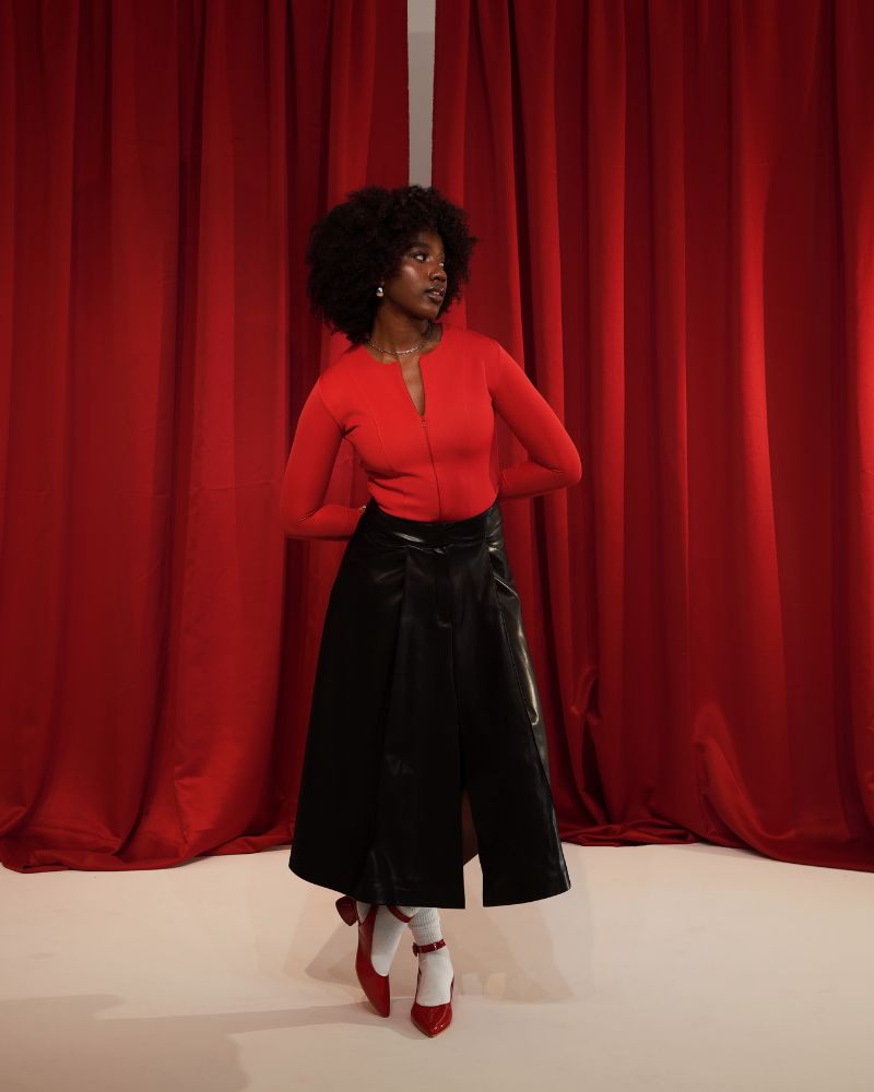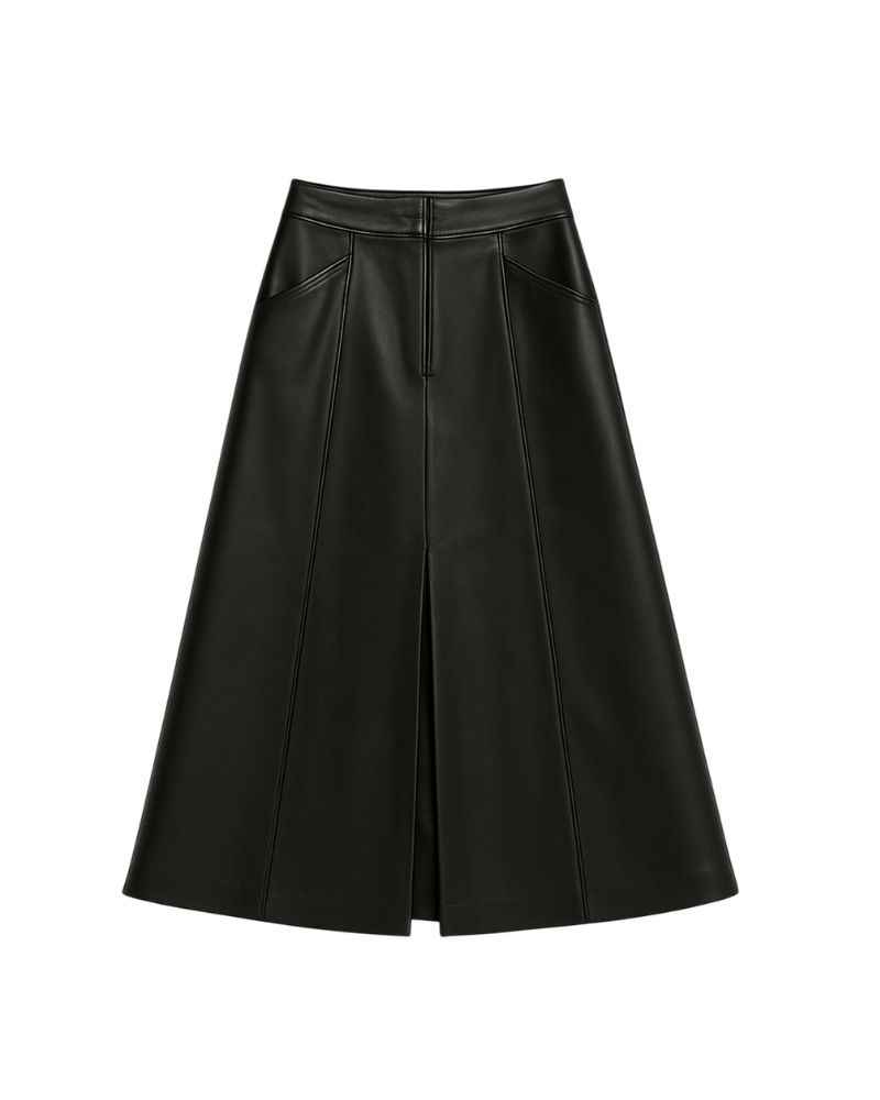 Falda en eco cuero liviano negro , tiro alto con prenses y abertura .