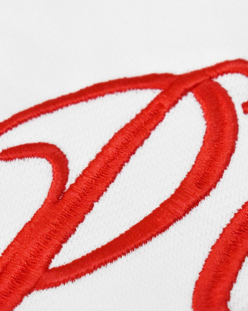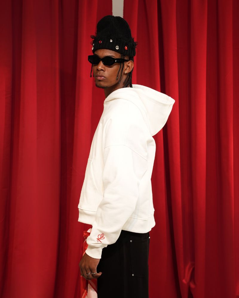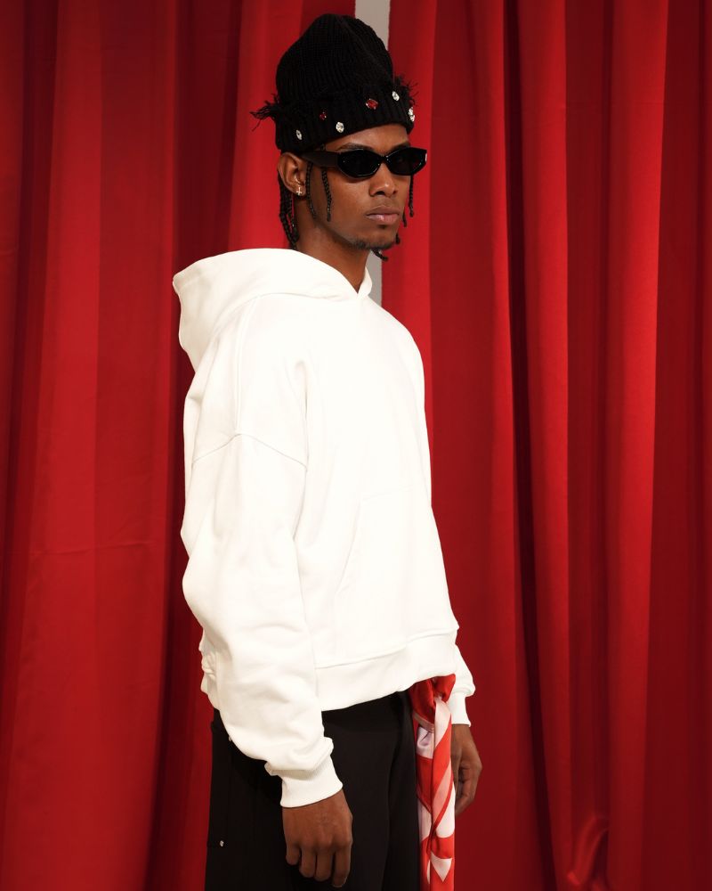 Hoodie marfil en burda pérchada de 400 gramos disponible en horma Box fit y regular , con bordado en espalda y manga rojo.